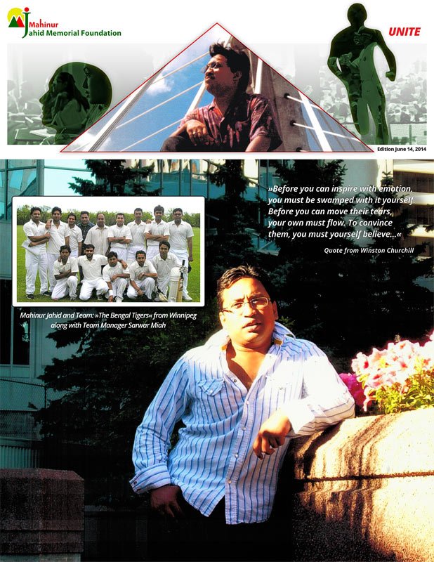 UNITE is a magazine published by the Mahinur Jahid Memorial Foundation (MJMF) issued to the Bangladeshi community. A first edition was released on June 14, 2014 during the official inauguration event here in Edmonton, a cricket match to celebrate team sports in memory of Mahinur Jahid. It is planned to publish the magazine at least once a year.
